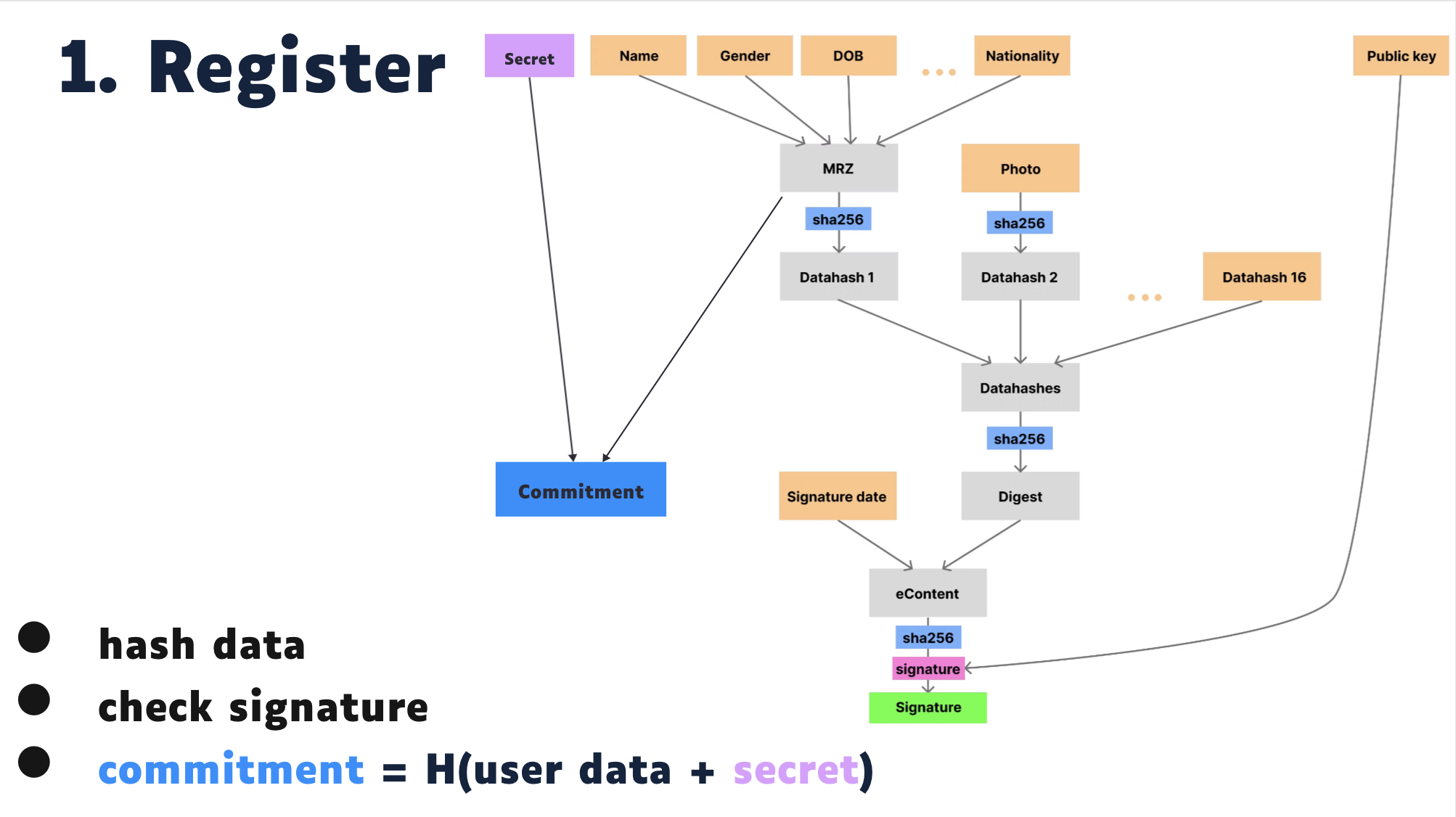 The first step is registration. It allows users to prove their passport is valid without revealing any of their private data.